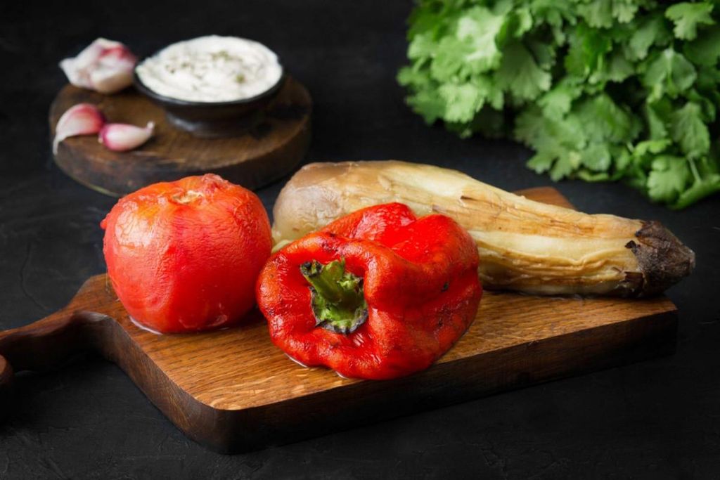 Перец болгарский на углях становится мягким и сочным, а помидор - нежным и сладким. Баклажан также приобретает мягкость и приятный вкус благодаря жарке на углях. Зелень добавляет свежести и аромата к блюду.